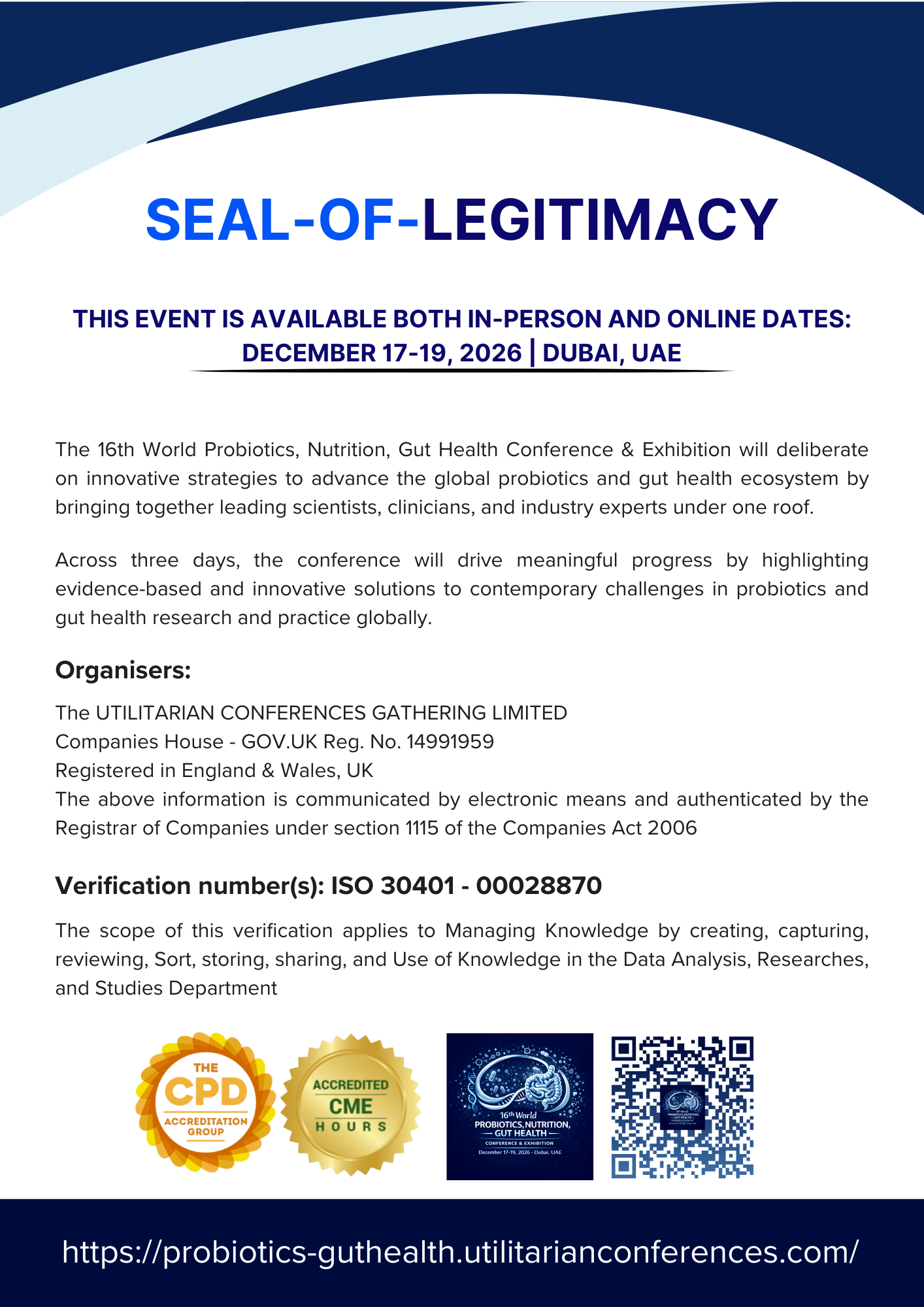 The Seal of Legitimacy of the PROBIOTICSUCG: HYBRID Conference & Exhibition signifies its credibility as a globally recognized and professionally organized scientific event. It reflects the conference’s commitment to academic integrity, transparent processes, and high-quality scientific standards in the fields of probiotics, nutrition, and gut health.