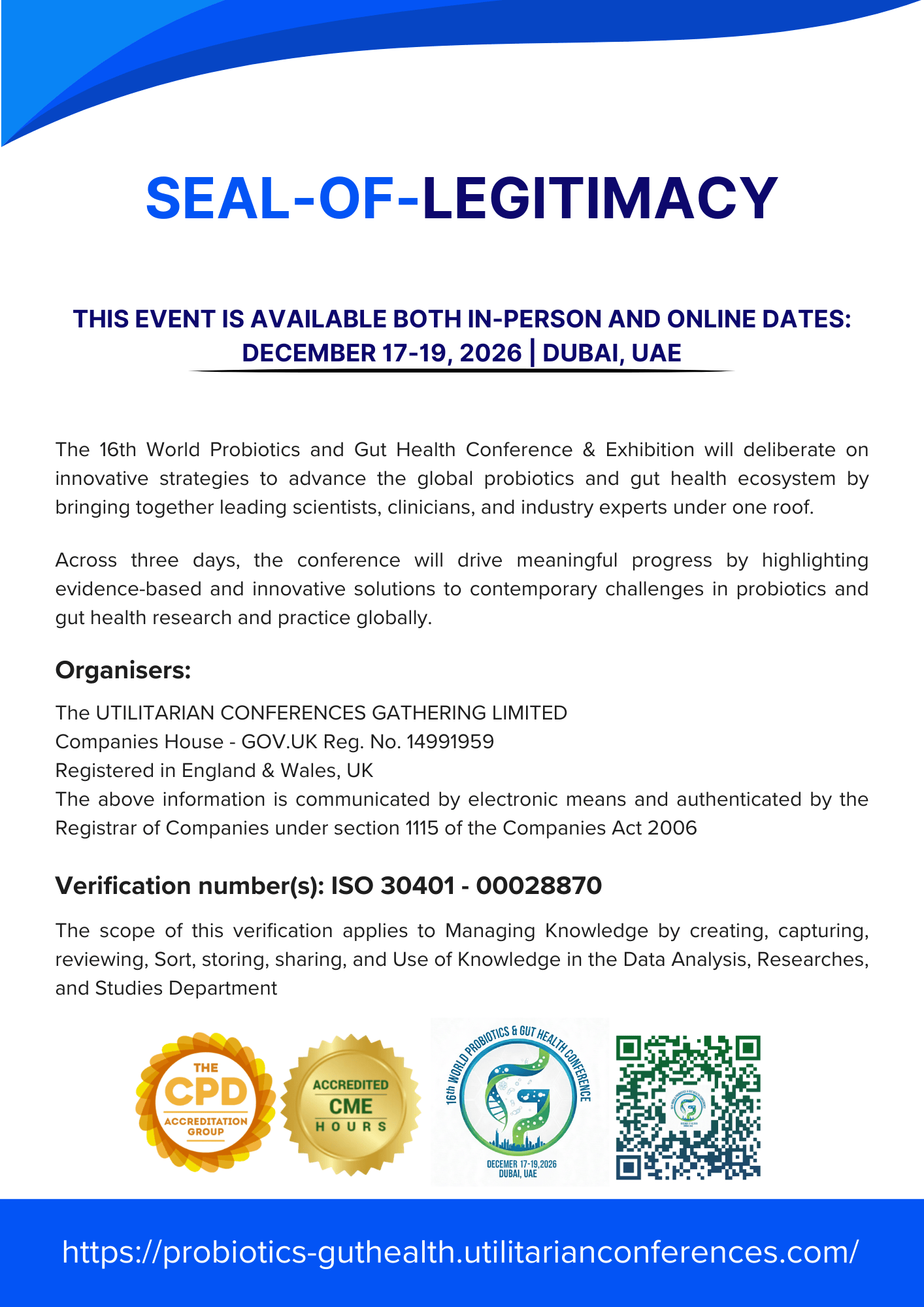 The Seal of Legitimacy for the 16th World Probiotics and Gut Health Conference & Exhibition (ProbioticsUCG 2026) reflects its status as a globally recognized and trusted platform for scientists, clinicians, researchers, and healthcare professionals advancing the fields of probiotics, microbiome science, and gut health.