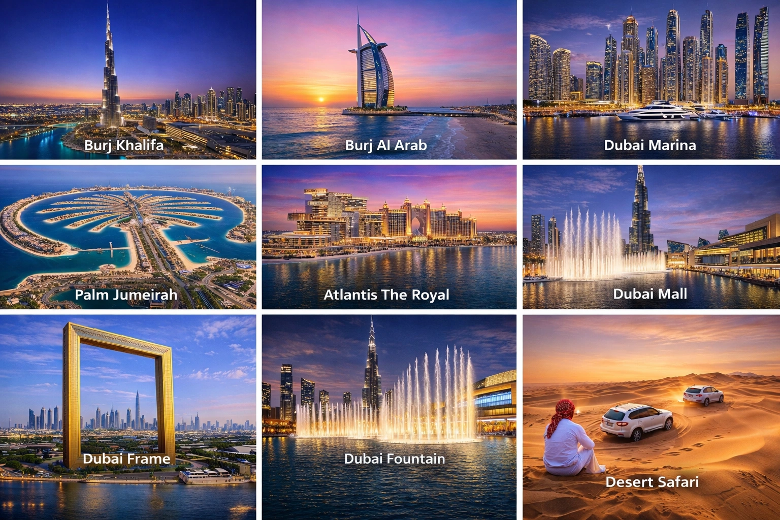 • Burj Al Arab – The iconic sail-shaped luxury hotel, representing Dubai’s global reputation for innovation, hospitality, and opulence.